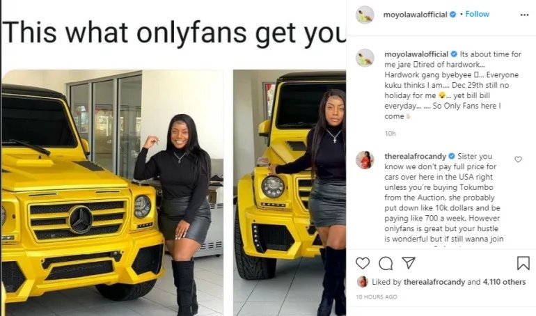 Sister you know we don’t pay full price for cars over here in the USA right unless you’re buying Tokumbo from the Auction, she probably put down like 10k dollars and be paying like 700 a week. However, only fans is great but your hustle is wonderful but if still wanna join come to use my Referral at onlyfans/ AfroCandy