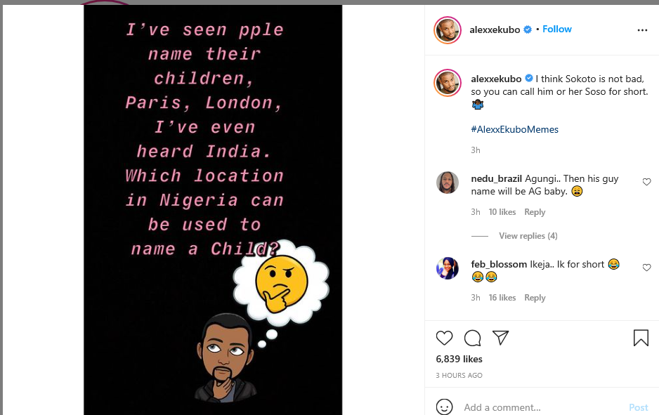 Alex Ekubo further asked Nigerians the name of a location in the country that can be used to name a child.