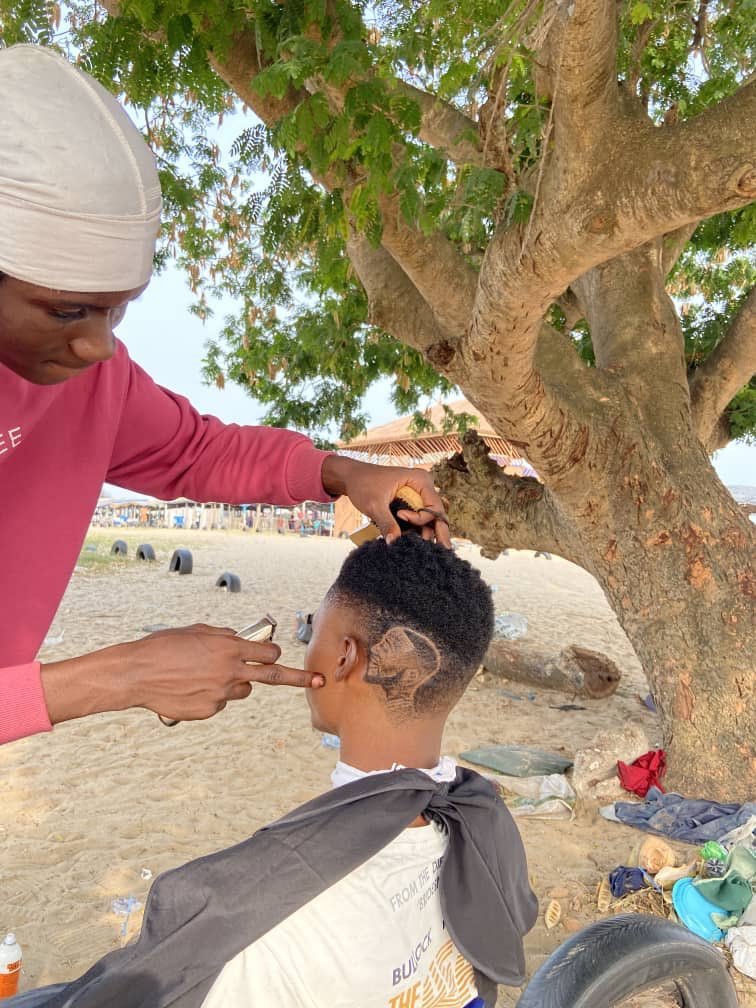 The surprising part is that the work wasn’t done in a barber shop or hair saloon, but was done under a tree where the barber has no mirror to reflect his jobs from different views.