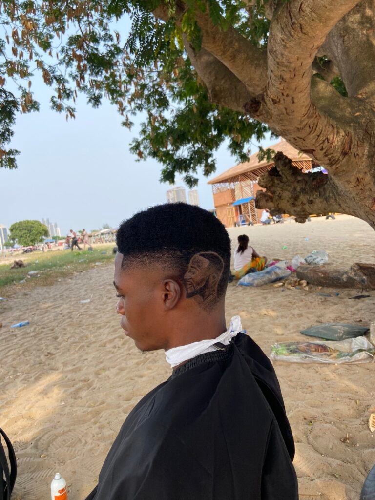 A cleaver young barber who has no shop carved the portrait of Davido’s head just beneath the left ear of his client.