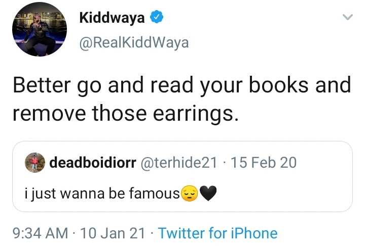 Better go and read your books and remove those earrings. Kiddwaya wrote.