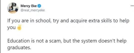 This becomes worrisome as some people and up in situations that are disheartening. The ex-housemate of BBNaija has however brought up an idea which when considered can be of help to undergraduate students. According to the ex-girlfriend of Ike Onyema, education is not a scam because it’s needed but then learning some other skills aside from book would also help.