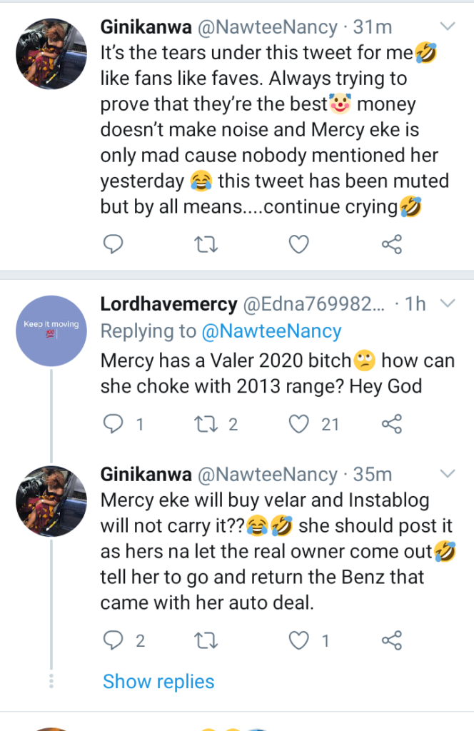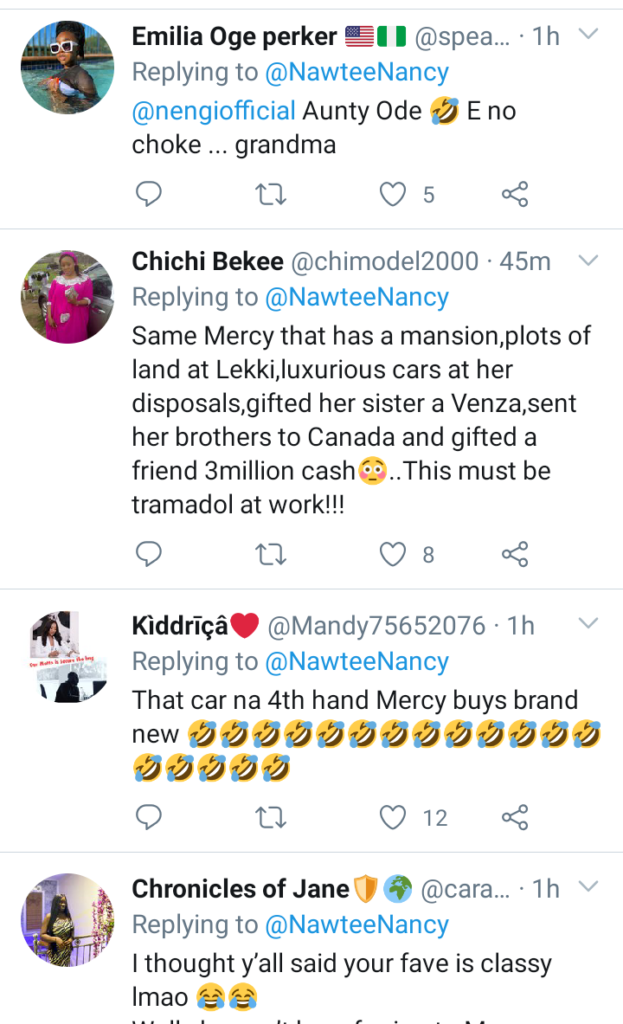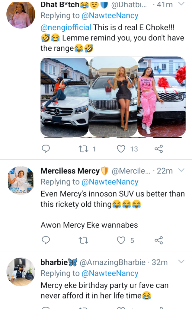 Mercy Eke fans, on the other hand, said that it takes fans to buy Benz for Nengi, but Mercy Eke comfortably got her cars without help. They also stated that Mercy Eke has mansions, plots of lands in Lekki, luxurious cars and also classy.
