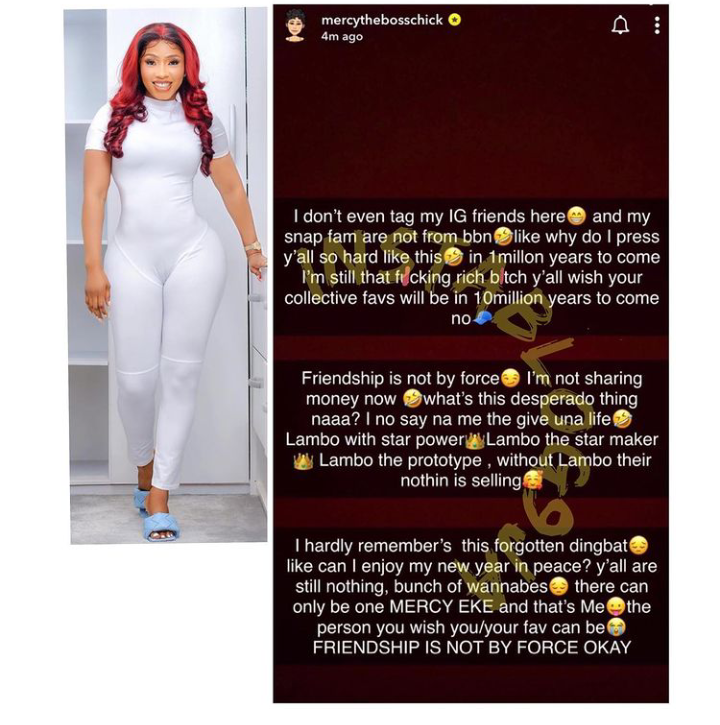 Few hours after that, Mercy Eke took to her Instagram story and addressed people who called her out for not wishing Nengi a happy birthday. She stated that friendship is not by force, and she is ten times better than their favourite.