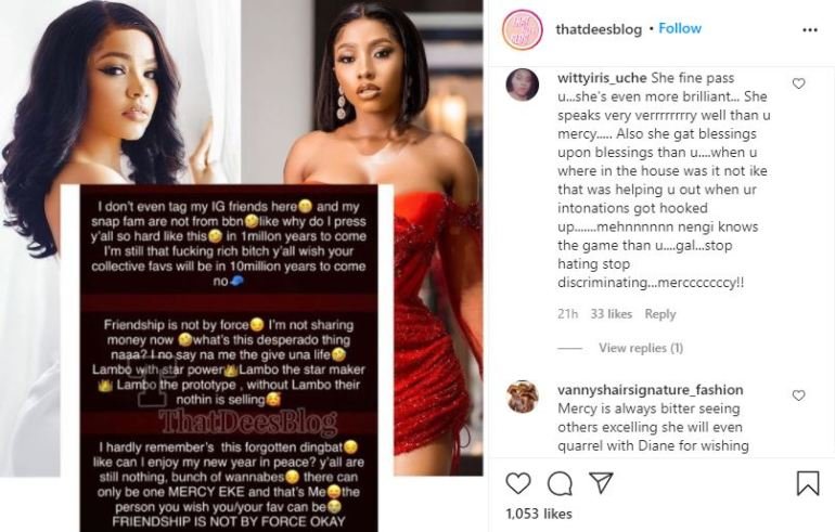 Big Brother Naija season four winner, Mercy Eke, has been dragged by one of Nengi fans on social media about her unwarranted post about her friendship with the former Big Brother season five housemate.