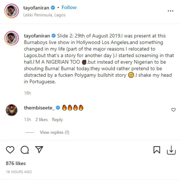 …I was present at this Burnaboys live show in Hollywood Los Angeles, and something changed in my life (part of the major reasons I relocated to Lagos, but that’s a story for another day ), I started screaming in that hall,I’M A NIGERIAN TOO ✊🏿,but instead of every Nigerian to be shouting Burna! Burna! today, they would rather pretend to be distracted by a fucken Polygamy bullshit story 🤨,I shake my head in Portuguese.”