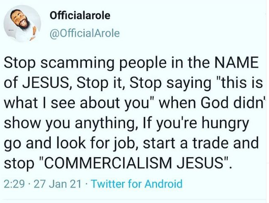 Stop scamming people in the NAME of JESUS, Stop it, Stop saying “this is what I see about you” when God didn’t show you anything, If you’re hungry go and look for job, start a trade and stop “COMMERCIALISM JESUS” he said