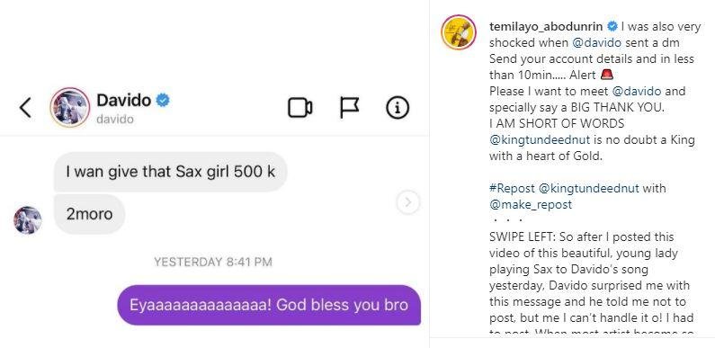 This got to the notice of Afro-Pop musician, Davido Adeleke. In His generousity he gifted the sum of N500K to the 10-year-old saxophonist