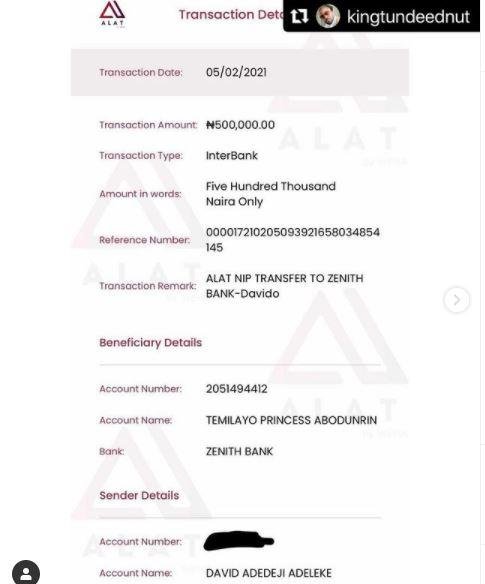 Confirming the payment, Temilayo wrote;