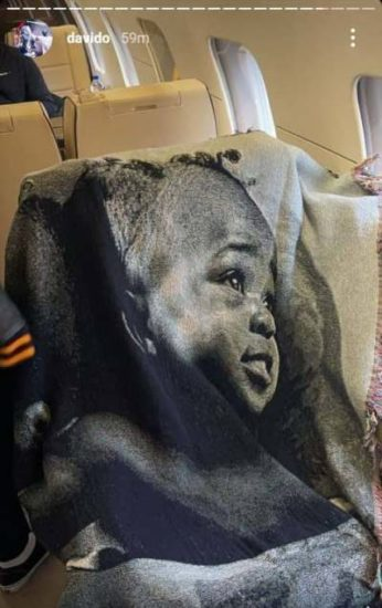 Sharing a photo of himself on his private jet, the face of Davido’s son is seen boldly customized on a plus-size blanket as a declaration of father-son love despite the distance keeping them apart.
