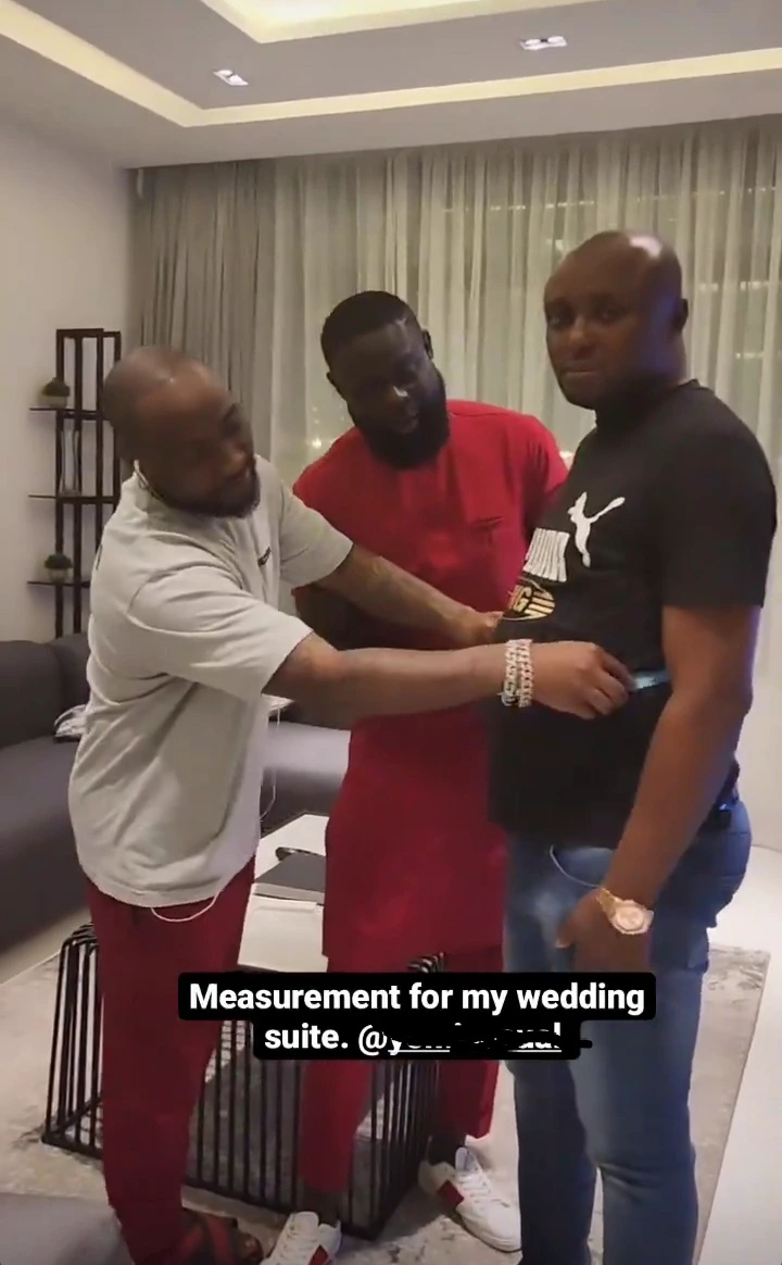 Yomi Casual, the tailor who will sew his wedding suit, was at their house yesterday to take Davido and Israeldmw’s measurements. Davido approached him while he was taking Israeldmw’s measurements and took the tape from him.