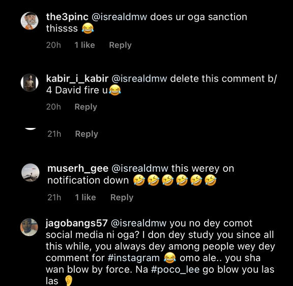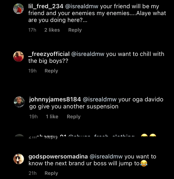 However, things took another turn when Israel liked and commented on the same photo. As expected Wizkid FC wasted no time in dragging him into the mud.