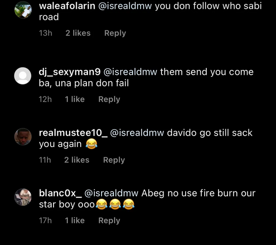 Another added; “davido go still sack you again 😂”