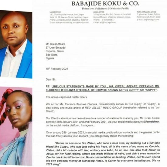 A letter of DJ Cuppy’s demand in lawsuit filed against Davido’s PA, Israel has surface online.