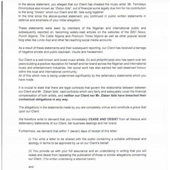 DJ Cuppy’s lawyers demanded a public apology from him over his claim that Zlatan didnt make any money from their song, Gelato