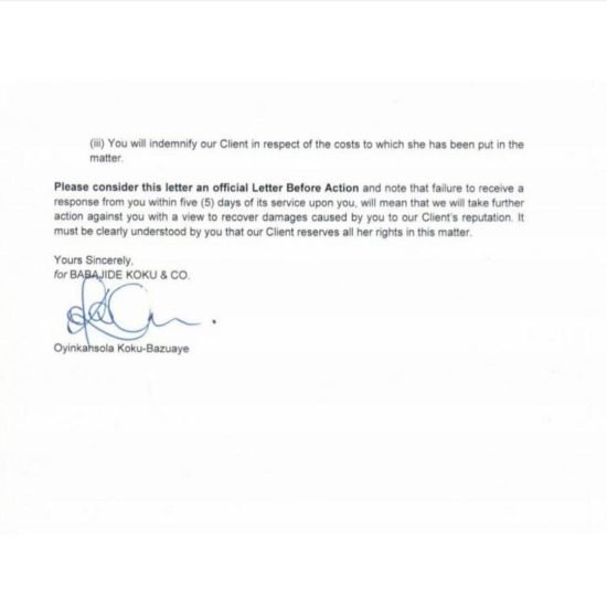 She got her lawyers to write to him, demanding a letter of apology and withdrawal of his statement that will be shared publicly.