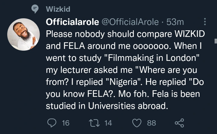 Woli Arole stated that no one should ever compare Wizkid with Fela Anikulapo Kuti in his presence. He claimed that when he went to a school in London to study filmmaking, a lecturer asked him where he was from, and he replied that he was from Nigeria. He instantly stated that he is from Nigeria. He was surprised that a white man could know Fela Anikulapo Kuti when the instructor inquired if he knew him.