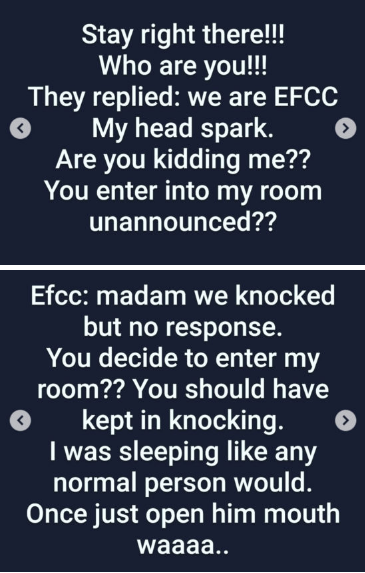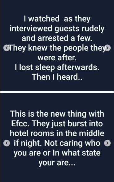 After several questionings, Biodun stated that the EFCC members left her room without harming her but they arrested a few people before leaving the hotel compound.