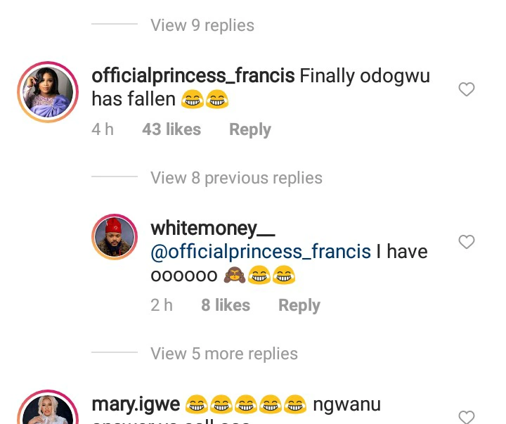 Princess Francis, another Big Brother Naija star, reacted after White Money revealed this. White Money was dubbed ‘Odogwu’ by Princess, who said that he had fallen. She also included some laughing emoticons.