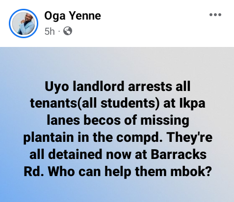Five Uyo University students were detained when their land lord’s plantain went missing.