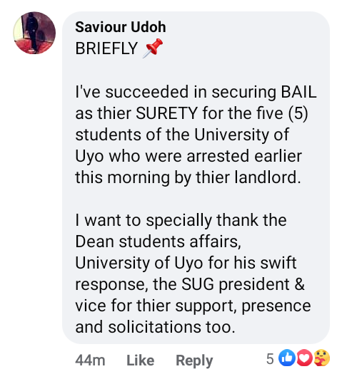 “I’ve succeeded in securing BAIL as thier SURETY for the five (5) students of the University of Uyo who were arrested earlier this morning by thier landlord. I want to specially thank the Dean students affairs, University of Uyo for his swift response, the SUG president & vice for thier support, presence and solicitations too.”
