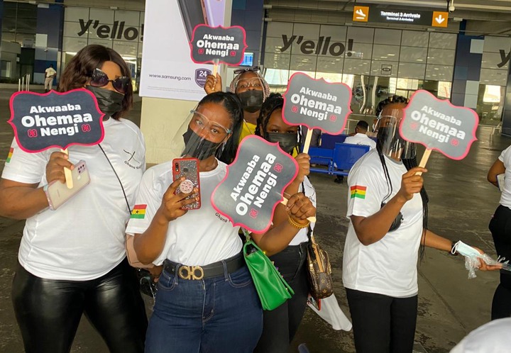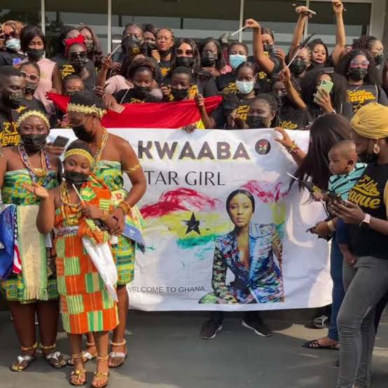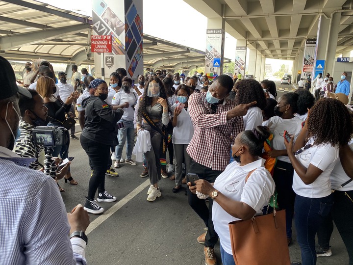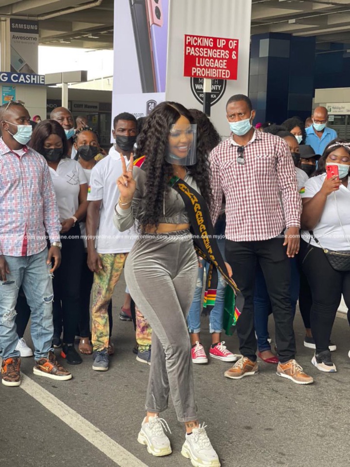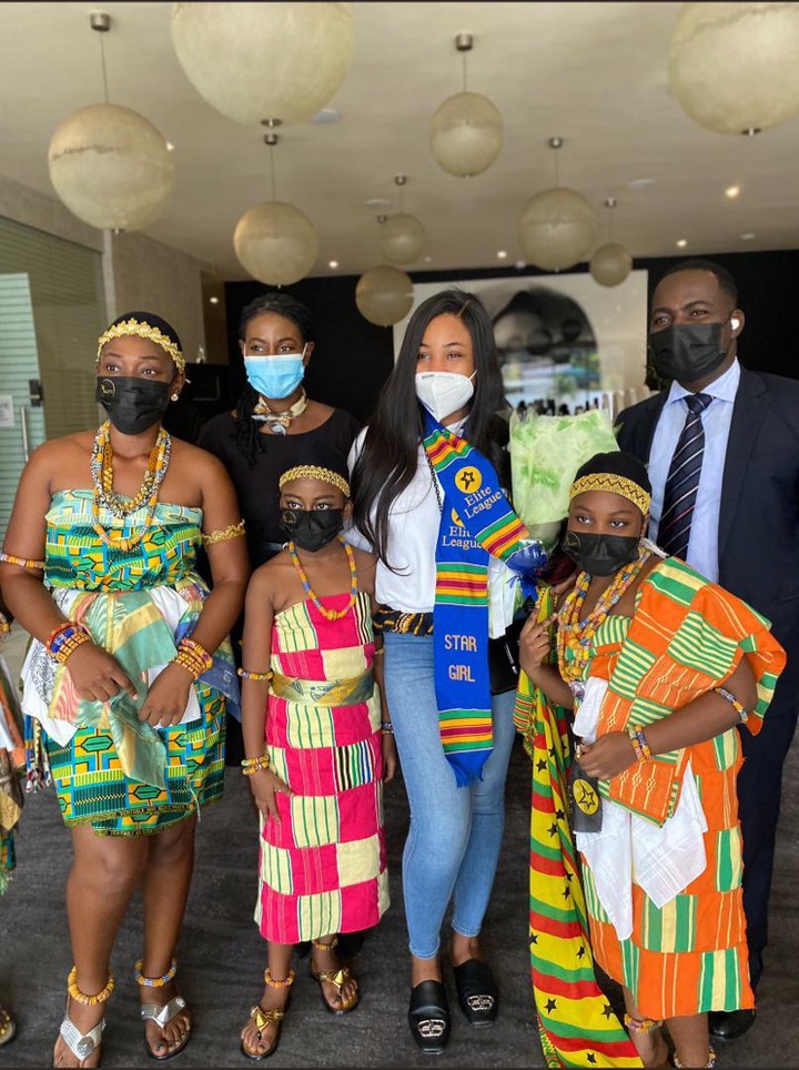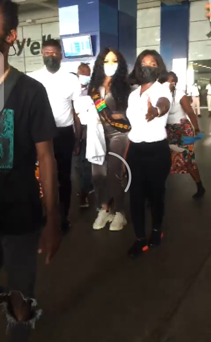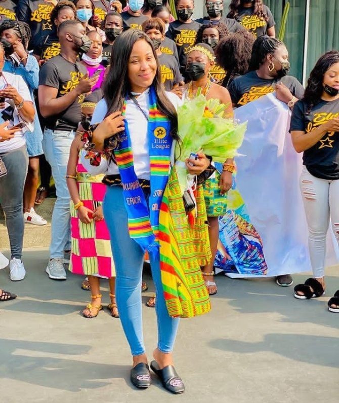 She was welcomed by traditional dancers, and many other people, both young and old. Her fans gave her flowers and took pictures with her. When Erica was leaving the airport and was heading to hotel where she would be in, throughout her stay in Ghana, she was accompanied with a convoy of exotic cars, such as Mercedes Benz, Porsche and Bentley.