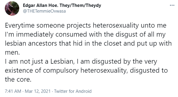 Every time someone projects heterosexuality unto me I’m immediately consumed with the disgust of all my lesbian ancestors that hid in the closet and put up with men. I am not just a Lesbian, I am disgusted by the very existence of compulsory heterosexuality, disgusted to the core.
