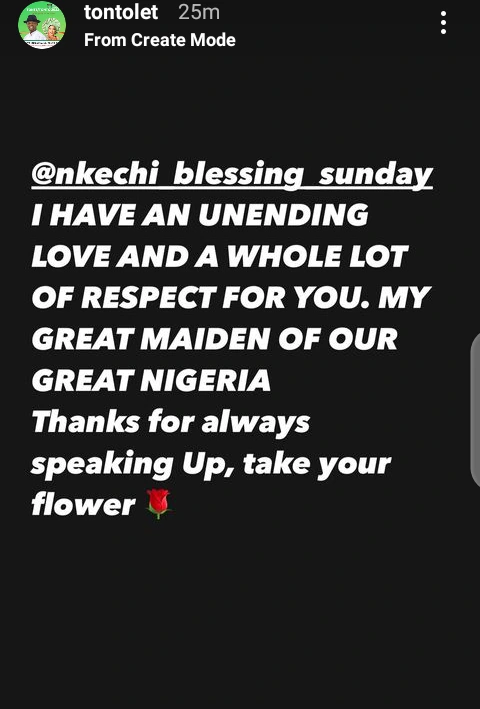 As a result of the curvy actress’s defense, Tonto Dikeh, a candidate for Rivers State’s deputy governorship, responded on her official Instagram story. Dikeh said she has a great deal of respect for Nkechi Blessing Sunday and that she is a great Nigerian woman.
