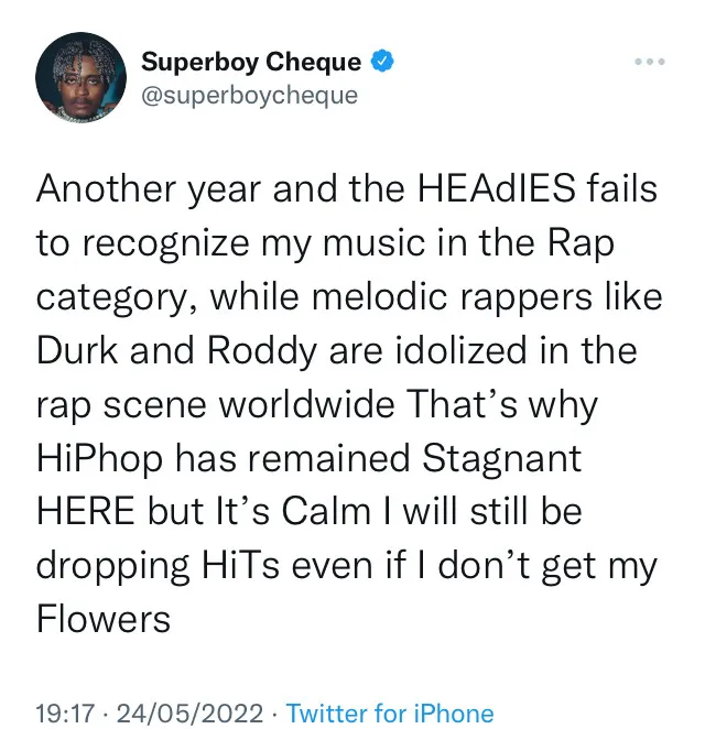 “Another year and the HEAdIES fails to recognize my music in the Rap category, while melodic rappers like Durk and Roddy are idolized in the rap scene worldwide That’s why HiPhop has remained Stagnant HERE but It’s Calm I will still be dropping HiTs even if I don’t get my Flowers”, he tweeted.