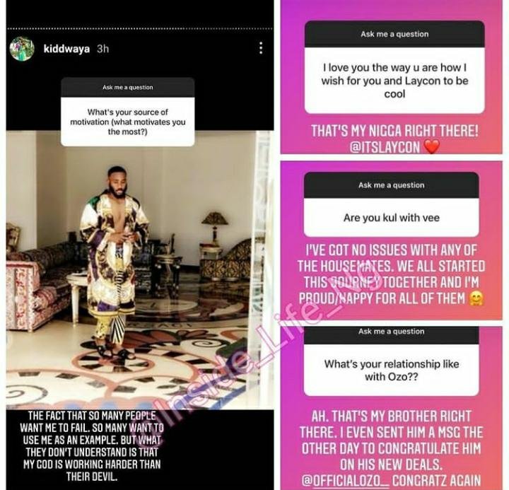 Kiddwaya also revealed that he has no issues with any of the housemates. According to him, they all started this journey together, and he is proud/happy for all of them.