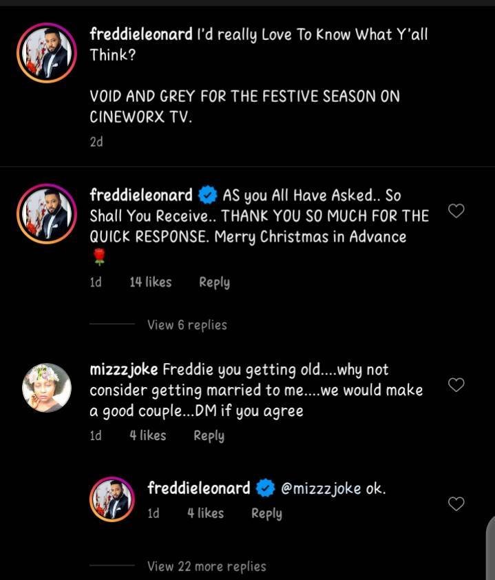 Freddie you are getting old. Why not consider getting married to me. We would make a good couple, DM if you agree. Freddie replied saying; Okay