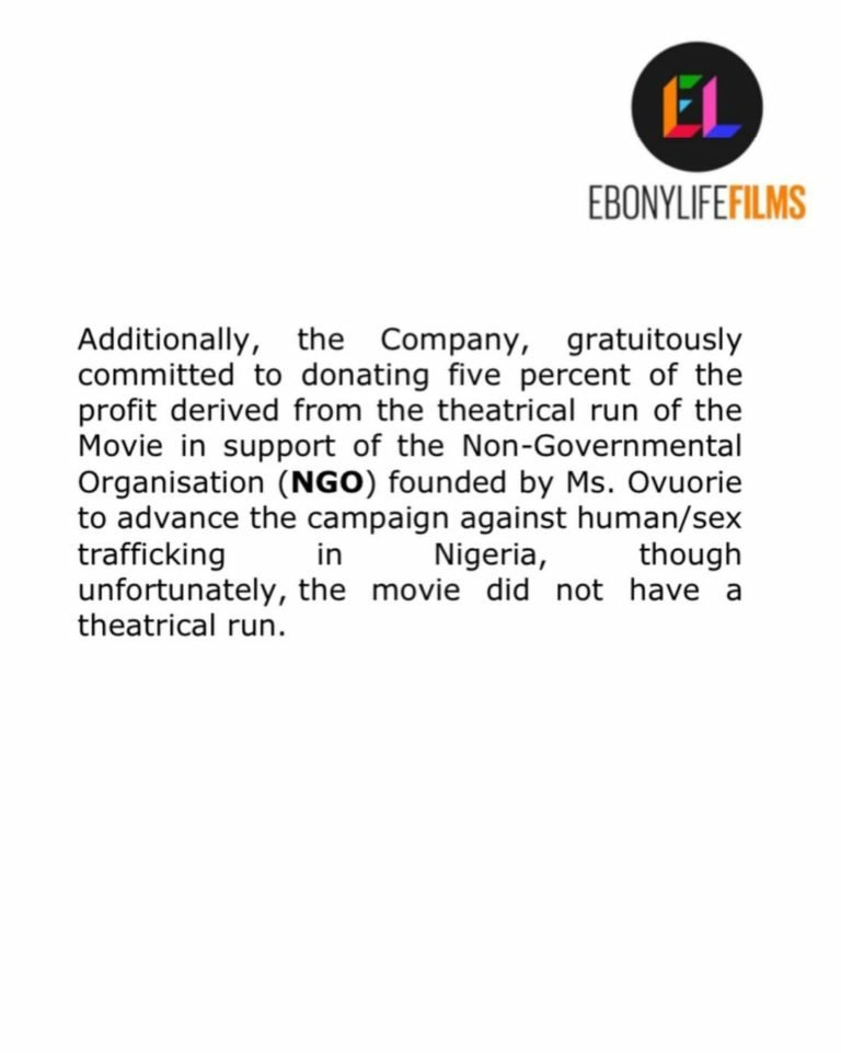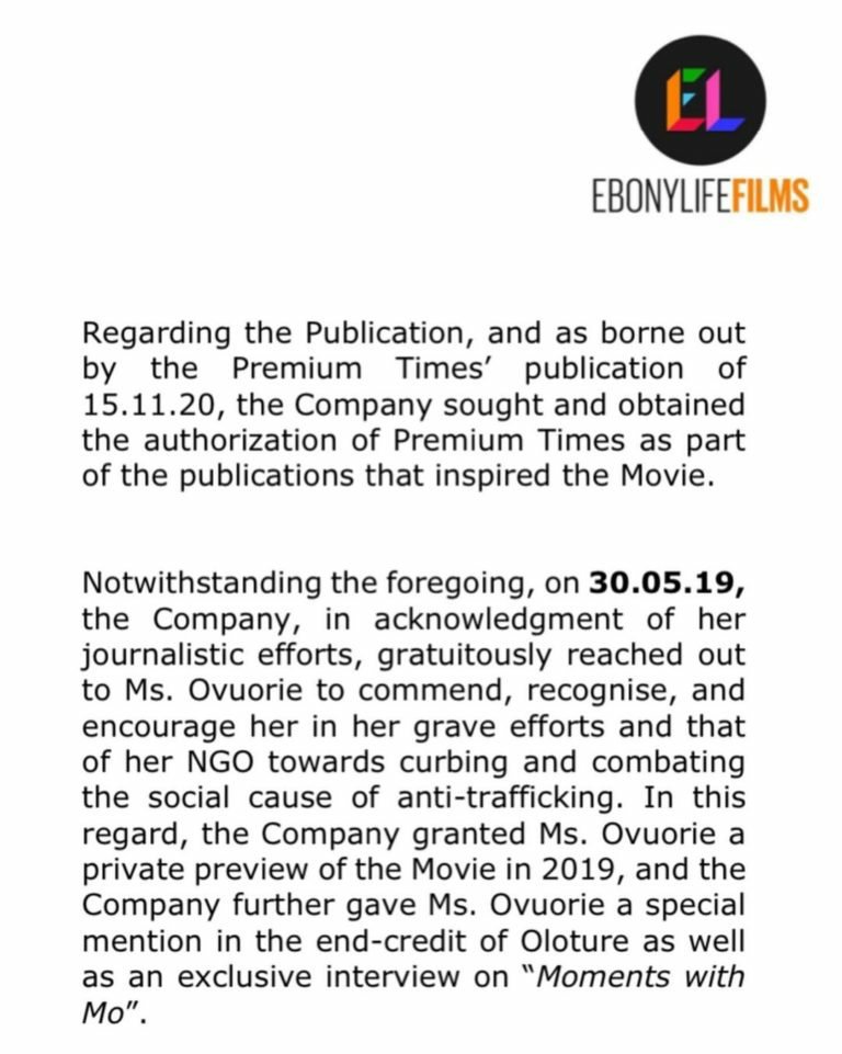 Our Attention has again been drawn to the continued media engagements of Ms. Tobore Ovuorie which borders on the unfounded allegation of copyright infringement in relation to Oloture (or “the Movie”) against EbonyLife Films (“EbonyLife” or “the Company”).