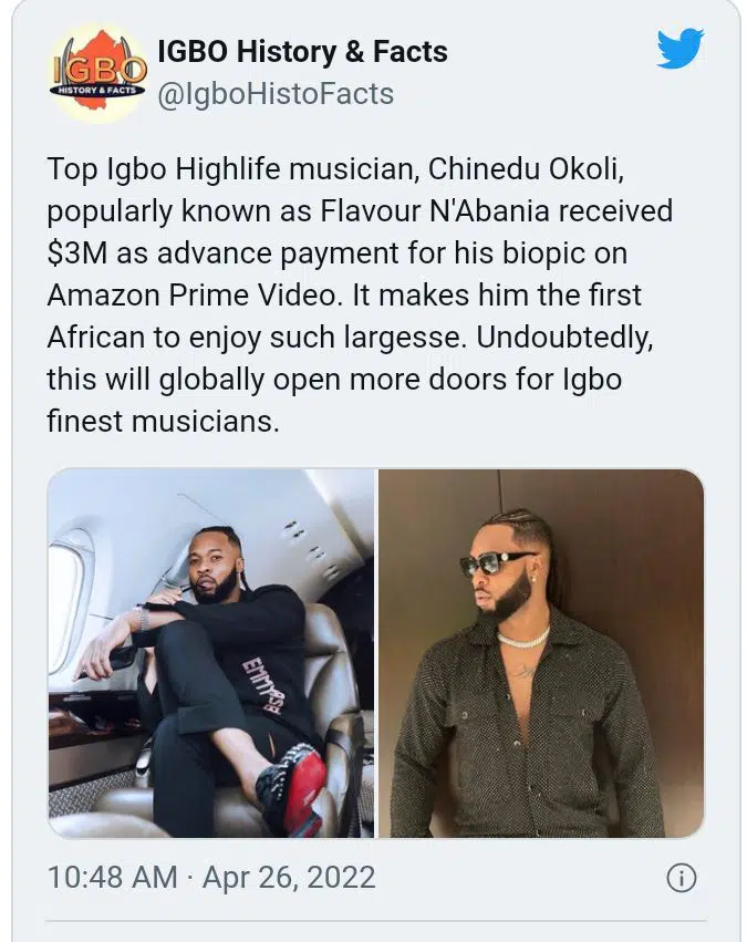@Igbo Facts wrote: “Top Igbo Highlife musician, Chinedu Okoli, popularly known as Flavour N’Abania received $3M as advance payment for his biopic on Amazon Prime Video.