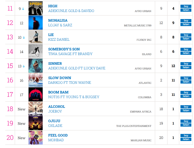 Other acts on the charts includes Wizkid, Omah Lay, Buju, Joeboy, Tiwa Savage and more.