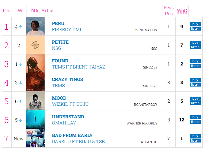 Sitting on the number one spot on the charts is “Peru” by Nigerian sensational singer. NSG’s “Petite” and Tems’ “Found” sits at Number 2 and 3 spot respectively.