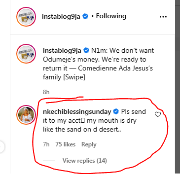Reacting to the video, Nkechi Blessing, in what may seem like a joke, pleaded to the family of the ailing comedian to send the money to her bank account as she needs such money.
