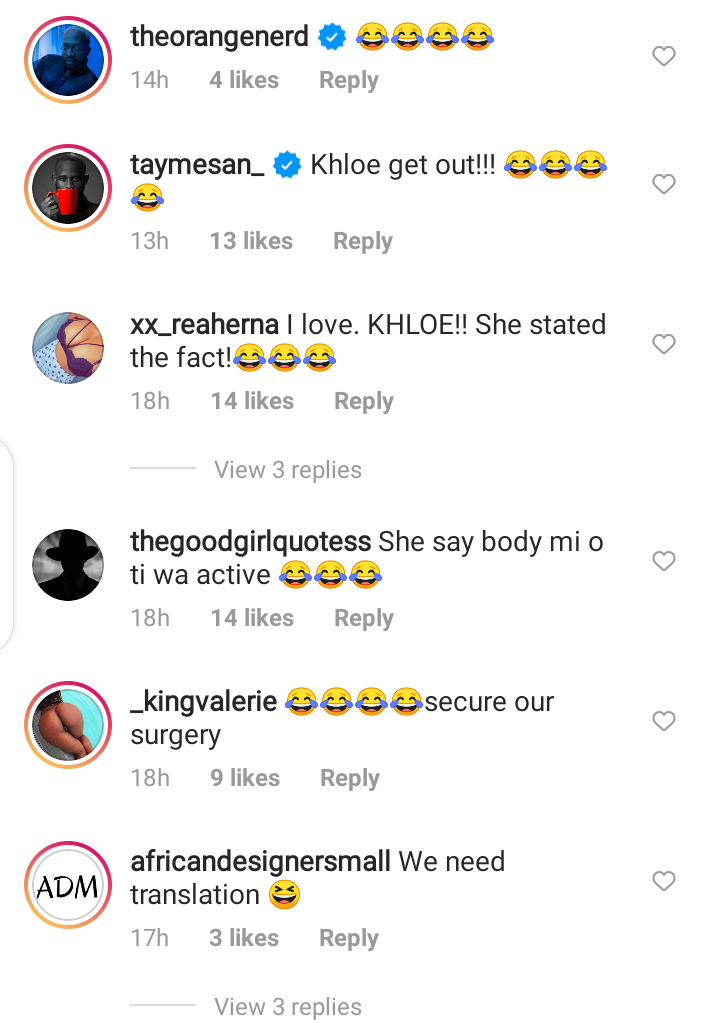 Khloe granted an interview, during interview, the interviewer pranked her saying there was pin somewhere in the chair she sat. Knowing that Khloe had done a surgery on her body. Khloe quickly stood up saying her butt has bursted in Youruba (“Idi ti be”)
