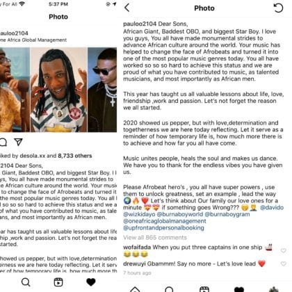 Dear Sons, African Giant, Baddest OBO, and biggest Star Boy. I love you guys, You all have made monumental strides to advance African culture around the world. Your music has helped to change the face of Afrobeats and turned it into one of the most popular music genres today. You have all worked so hard to achieve this status and we are proud of what you have contributed to music, as talented musicians and as African men. This year has taught us all valuable lessons about life, love, friendship, work and passion. Let’s not forget the reason we started. 2020 showed us pepper but with love, determination, togetherness we are here today reflecting. Let it serve as a reminder of how temporary life is, how much more there is to achieve, and how far you have all come. Music unites people, heals the soul and makes us dance. We have you to thank for the endless vibes you have given us. Please Afrobeats heroes, you all have superpowers, use them to unlock greatness, set an example, lead the way. Let’s think about our family and loved ones for a minute. If something goes wrong. @davido @wizkidayo @burnaboyworld @burnaboygram @oneglobalmanagement @upfrontandpersonalbooking