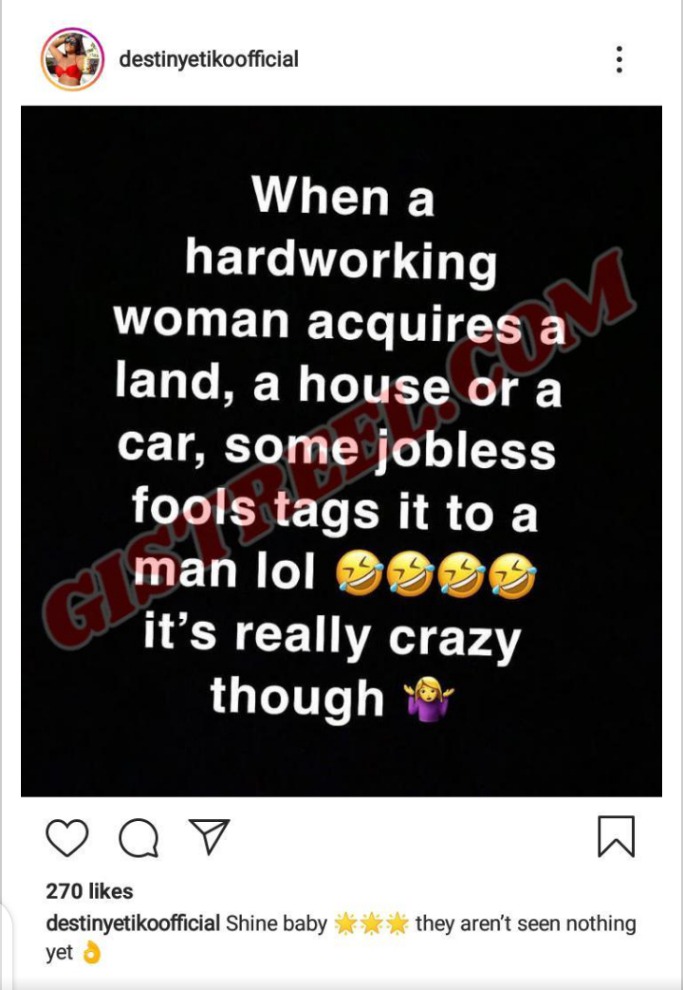 Destiny Etiko through her official Instagram page has reacted to the allegation. She wrote,