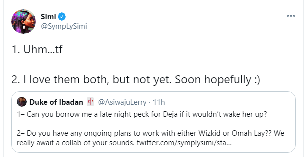 Simi has revealed to her fans on social media that although she loves Omah Lay and Wizkid, she is not ready to have a collaboration with them.