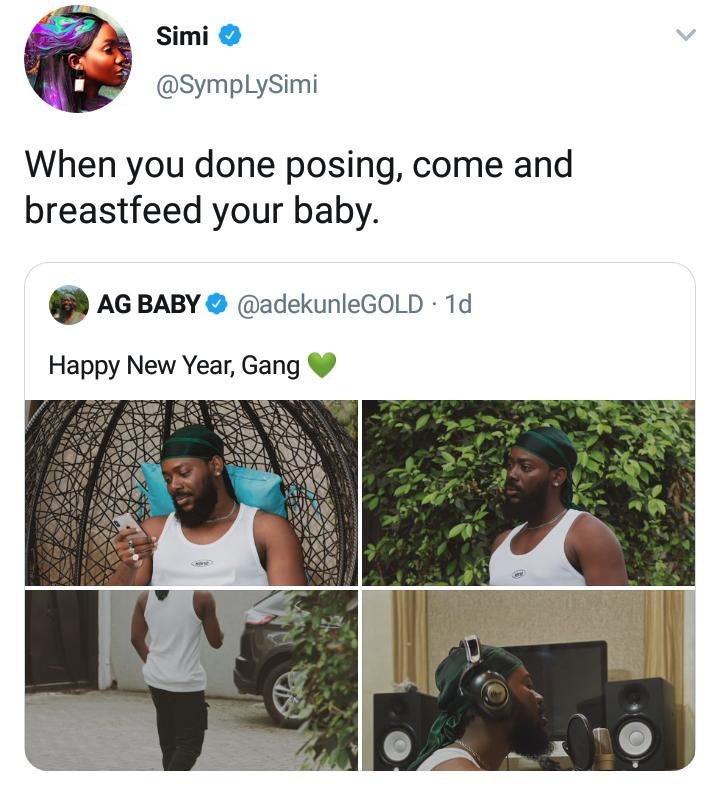 Seeing Adekunle Gold’s pictures, Simi told him to go and breastfeed their baby whenever he is done posing.