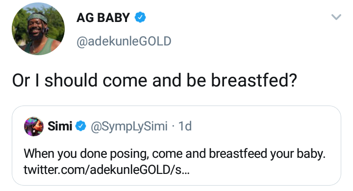 Replying her tweet, Adekunle Gold subtly asked her if she meant he should come so that she will breastfeed him. “Or I should come and be breastfed?” he asked.