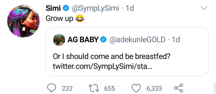 Reacting to his tweet, Simi laughed out loud and asked her husband to grow up. “Grow up”, she simply tweeted at Adekunle Gold.