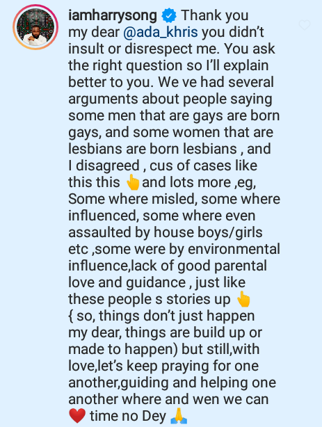 We have had several arguments about people saying some men that are gays are born gays and some women that are lesbians are born lesbians. I disagree cus of cases like this and much more. eg, some were misled, some were influenced, some were even assaulted by houseboys/girls etc,” he stated.
