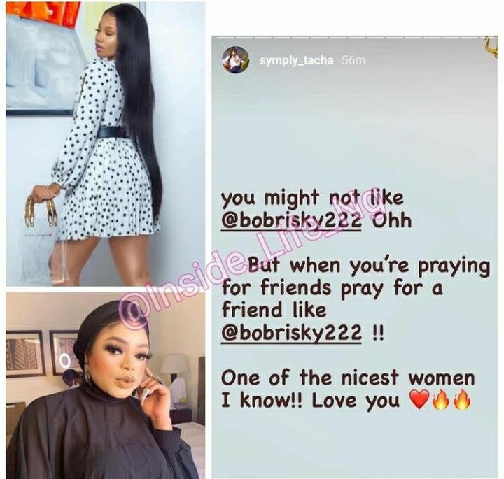 Tacha has taken to social media to hail Bobrisky for being one of the nicest women she has ever known, telling him how much she loves him.
