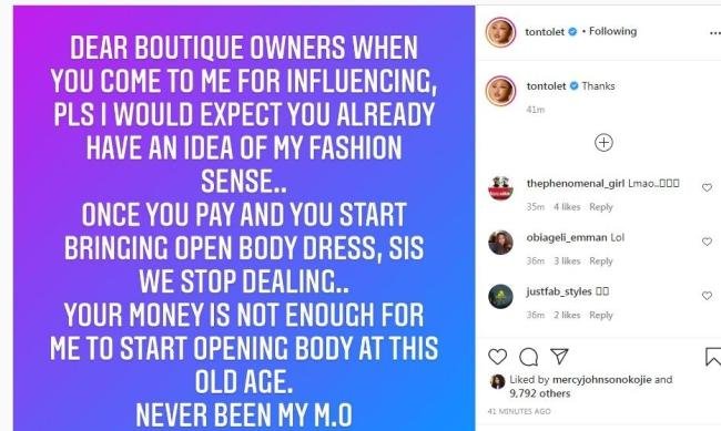 According to the mother of one, a brand is supposed to know her fashion sense before contacting her for brand influencing gigs.
