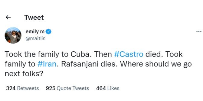 Emily, the lady, had tweeted that when she and her family went to Cuba, Fidel Castro, the country’s then-leader, died.