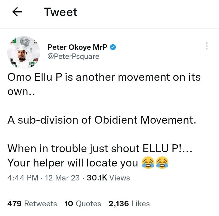 A subset of Obidient Movement is Obidient Movement. If you need help, just yell ELLU P! and someone will come to your aid “.